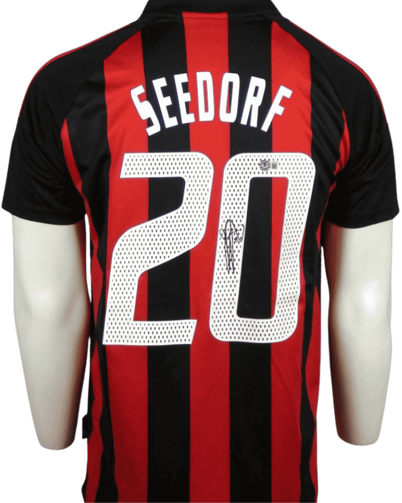 Dit is een gesigneerd thuisshirt van AC Milan, uit het seizoen 02-03. Achterop het shirt de naam en het rugnummer van de voormalig top middenvelder Clarence Seedorf.