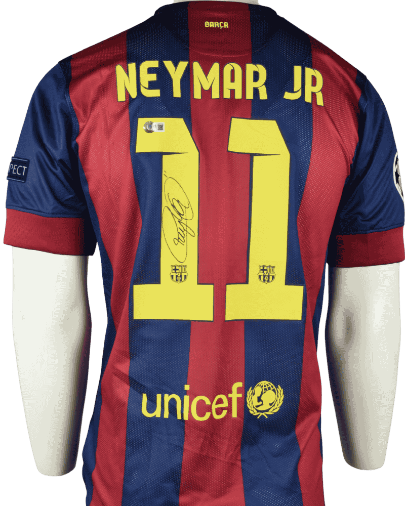 Dit is een gesigneerd thuisshirt van FC Barcelona. Champions League finale. 06-06-2015. Berlijn. Achterop het shirt de naam en het rugnr van de Braziliaanse, vedette Neymar.