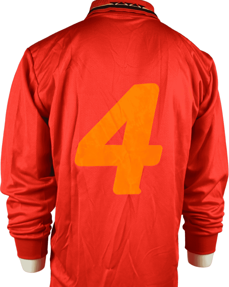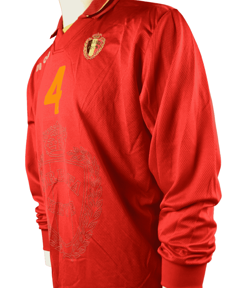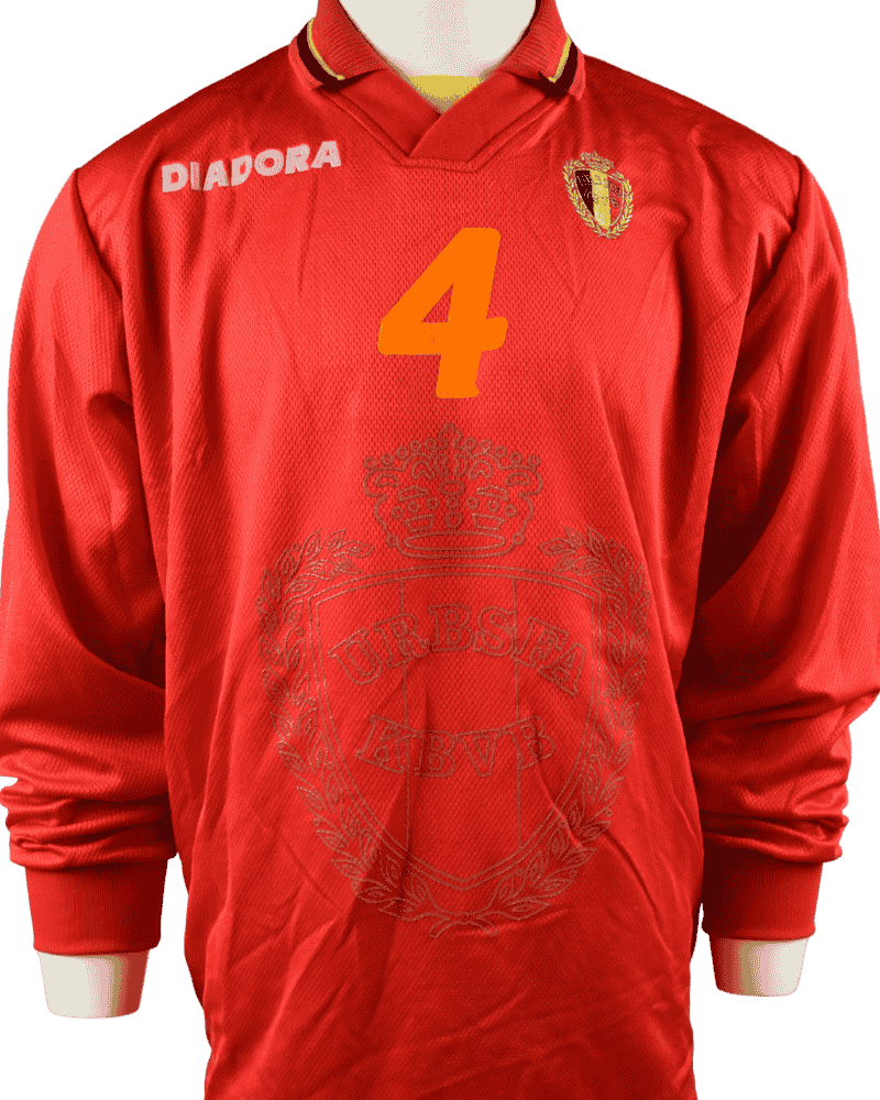 Dit is een thuisshirt van België. België-Nederland, op 14-12-1996. WK Kwalificatie wedstrijd. Achterop het shirt rugnummer 4 wat toebehoort aan verdediger, Pascal Renier.