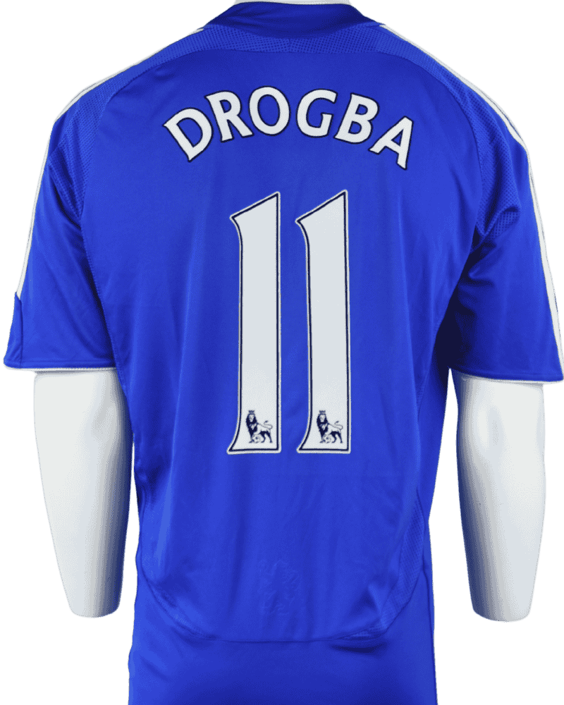 Achterop het shirt de naam en het rugnummer van de Ivoriaan, Didier Drogba. De topspits speelde in totaal 341 wedstrijden waarin hij 157 keer tot scoren kwam.