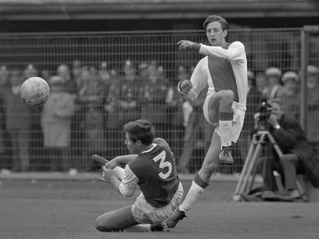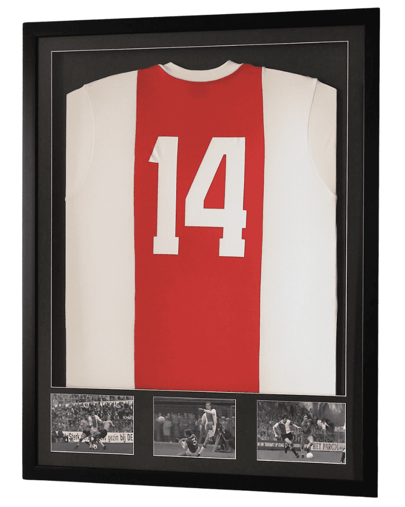 Johan Cruijff (Nr 14) Ingelijst Ajax thuisshirt met 3 foto’s en Naamplaatje