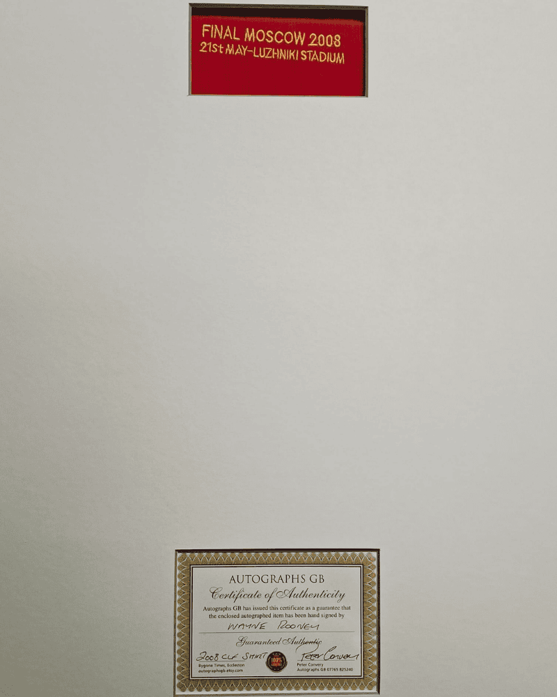 Het shirt is op zeer nauwkeurige wijze ingelijst. Met afmetingen van 93,3cm in de hoogte en 73,3cm in de breedte. Daarbij komt boven het shirt het logo van United, onder twee fotoโ€™s en in het midden de tekst: Personally Signed by Wayne Rooney – Manchester United – Champions League Winner 2008. Aan de achterkant van het frame komt het certificaat (zie foto).