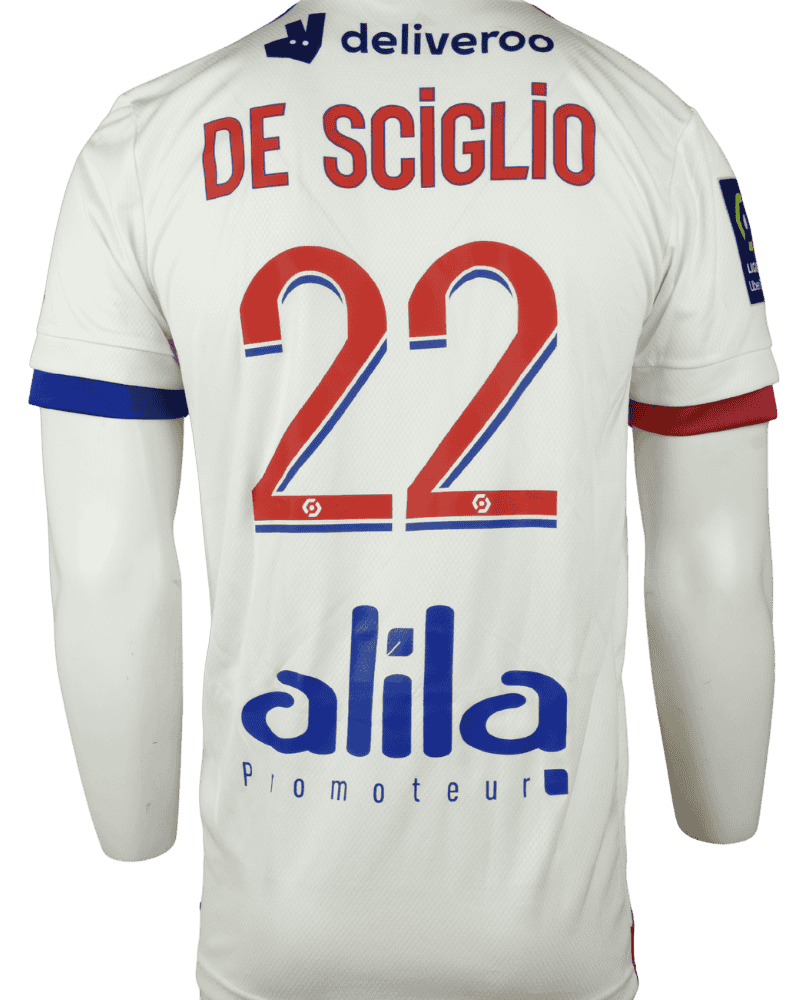 Dit is een matchworn thuisshirt van Olympique Lyon, uit het seizoen 20-21. Achterop het shirt de naam en het rugnummer van de Italiaanse rechtsback, Mattia De Sciglio.