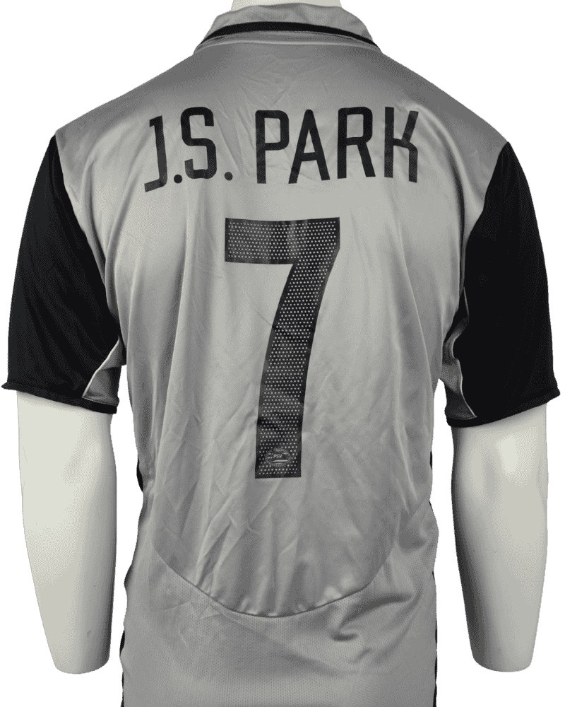 Dit is een matchworn uitshirt van PSV Eindhoven. FC Utrecht – PSV, op 07-03-2004. Achterop het shirt de naam en het rugnummer van buitenspeler Ji-sung Park, die het na de Eredivisie wedstrijd geruild heeft met voormalig FC Utrecht verdediger Pascal Bosschaart.