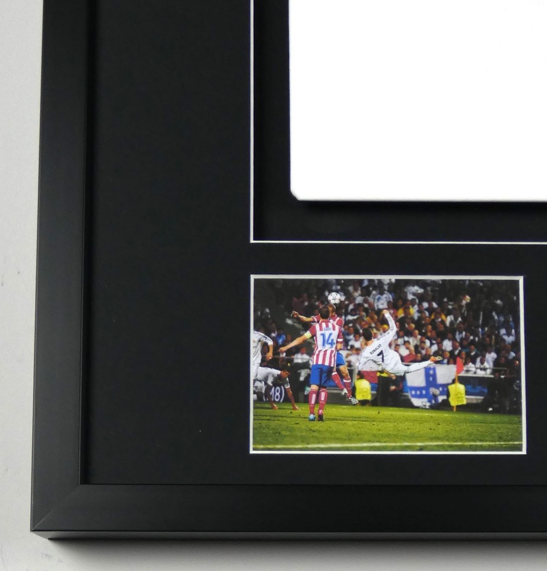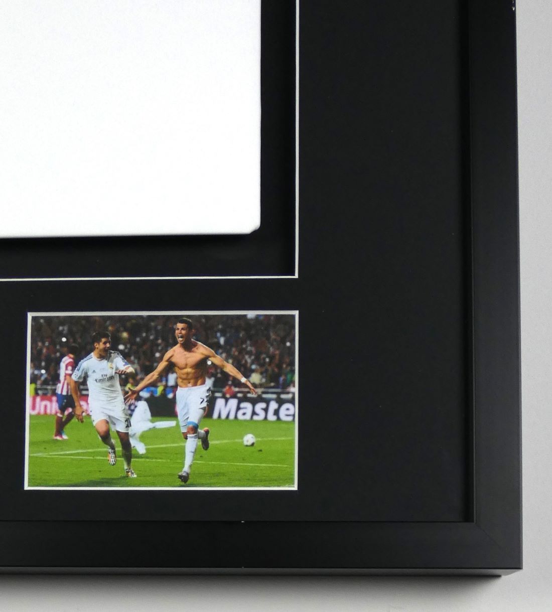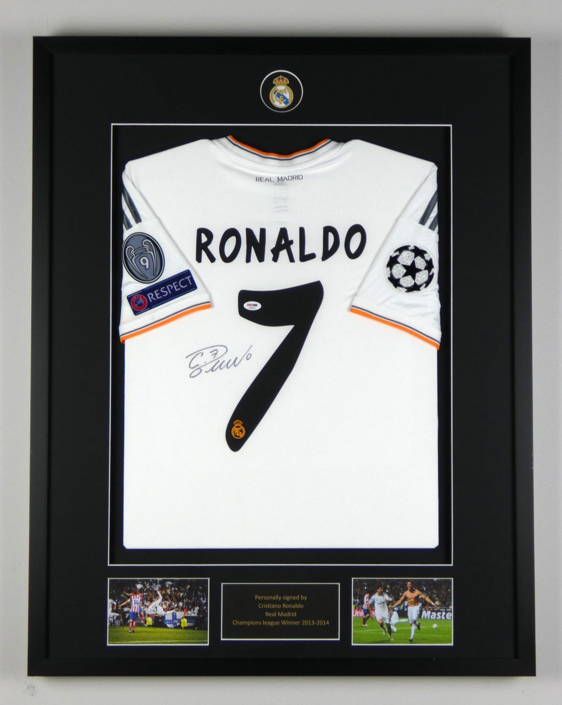 Het exemplaar is op zeer vakkundige wijze ingelijst in een frame van top kwaliteit. Met afmetingen van 93,3cm in de hoogte en 73,3cm in de breedte. Daarbij komt boven het shirt het logo van Real Madrid. Onder twee fotoโs (Maar je kan natuurlijk ook zelf foto’s uitkiezen) en in het midden de tekst: Personally signed by Cristiano Ronaldo – Real Madrid Champions League winner 2013-2014. Meer informatie, vragen of opmerkingen over het item. โLaat het me weten via de WhatsApp button (knop) links opย jouย beeldscherm.