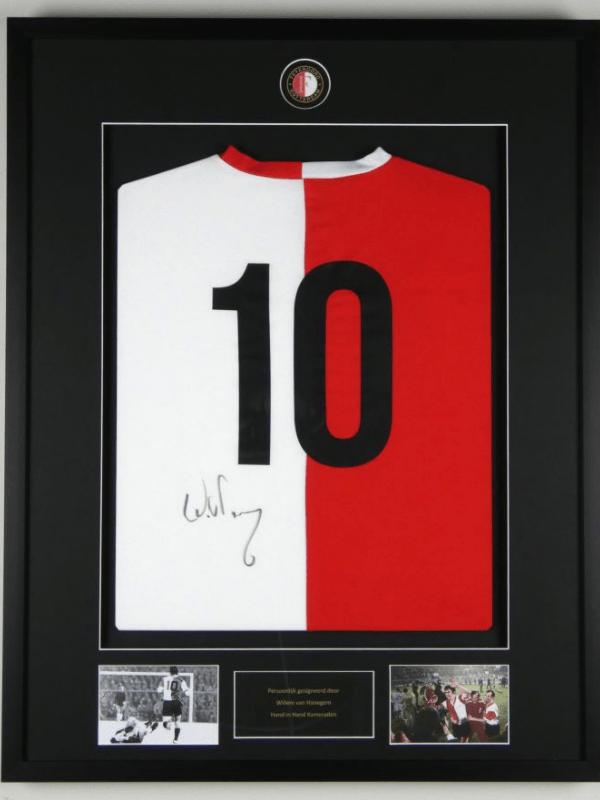 Feyenoord: Ingelijst thuisshirt in speciaal frame jaren 70 Gesigneerd door Willem van Hanegem (Incl. tekenfoto & tekenfilm)