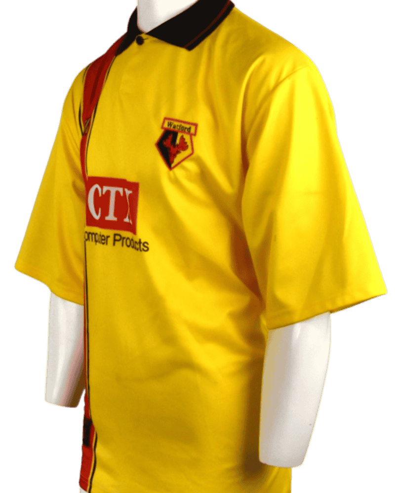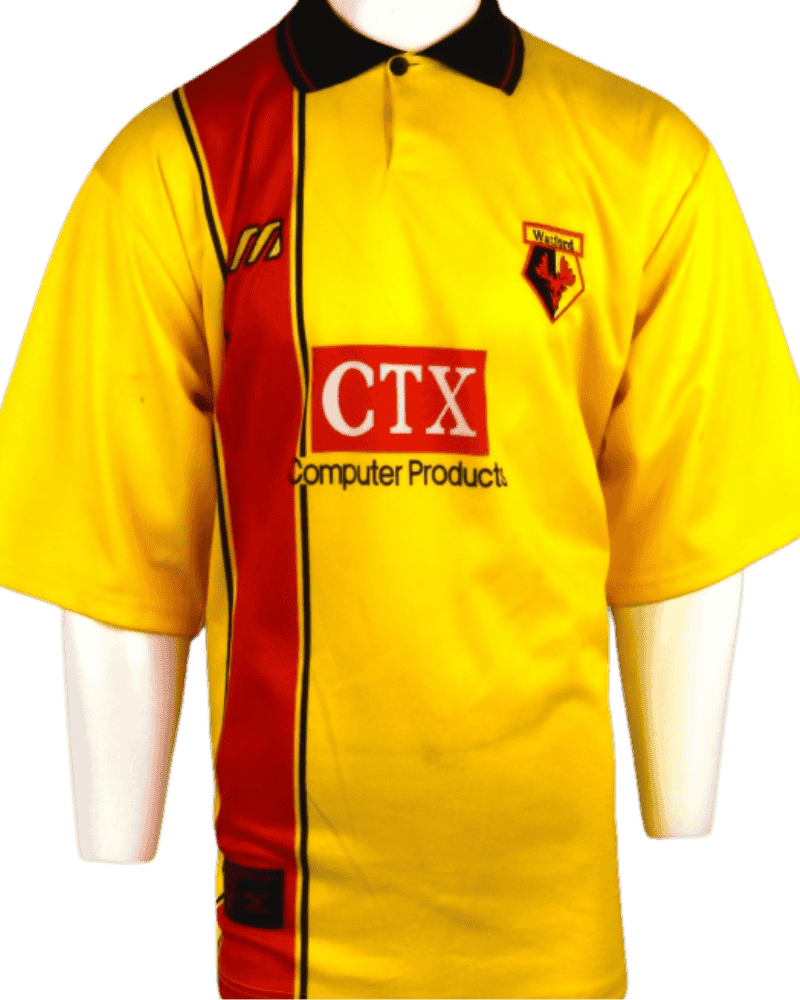 Dit is een vintage thuisshirt van Watford, uit seizoen 97/98.